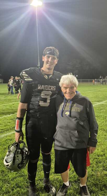 *Wyatt Frey, Kade Peters-Lawrence-Nelson - Division One recruit Wyatt Frey rushed 21 times for 271 yards and SEVEN touchdowns, was 7 of 8 passing for 80 yards and a touchdown, made seven tackles and had a 20 yard Pick 6 in the Raiders 78-42 win over Elmwood Murdock. Kade Peters, just a freshman, caught two passes for 34 yards which included a 31 yard TD, made six tackles and took a kickoff 70 yards to the house for an additional score.