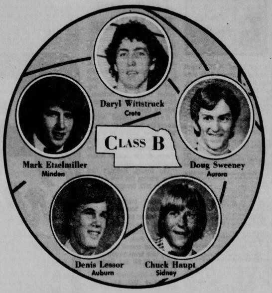 *Honor Roll: Doug Phelps-Hastings (Talk about an athlete!), Tom Marsden-Scottsbluff, John Selko-Lincoln East, Dave Copple-Norfolk, Sylvester Pierce-Omaha Central, Dave Blum-Millard, Rich Sheffe-Bellevue, John Kugler-McCook, Dan Clausen-Omaha Benson, Guy Frank-South Sioux City, and David Powell-Omaha North.