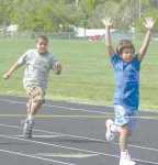 David Jaramillo clears the finish line and Vernon DeBerry follows in the 50 yard dash Friday during the McCook Central Elementary School track meet. Fourth and fifth graders competed in the annual track meet. Parents also had to run, walk or crawl with their kids in the annual Central Mile... -