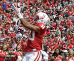 Husker receiver Jamal Turner hauls in a 29-yard touchdown pass from quarterback Zack Darlington. The Red team beat the White 24-15 Saturday at Memorial stadium in Lincoln.