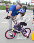 McCook Police Sgt. Kevin Darling, right, directs McCook Elementary first grader Rhilee Macumber through a weaving obstacle course during the school's annual State Farm Insurance "Bike Safety Rodeo" Tuesday afternoon. McCook High School junior Emmerie Roth, left, steadied Rambler Farr as he pedaled through a "short turn radius" course. ... -