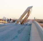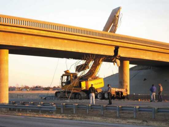 A Kansas Highway Patrolman takes notes at the scene of a truck driver's bad day Monday. Tor Olson said he, Matt Sehnert and Dale Dueland were returning from a folk music festival in Texas when they came upon the scene of the accident about 5:50 p.m. The track hoe, being pulled down Interstate 70, was too high to clear a bridge, and once it was caught, the arm was pulled through the deck of the bridge. The accident closed the interstate highway for a time. (Tor Olson/Olson's Photography)