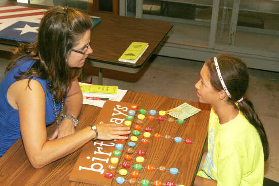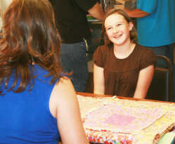 Twelve-year-old Patience Carman, right, of Oberlin, Kansas, giggles with Judge Rachel Boyle of Phillipsburg, Kansas, over the cut-and-snip process and color selections that went into making the "raggy quilt" that her grandmother, Norma Carman, helped her make for the Decatur County 4-H fair. On Tuesday morning, Boyle awarded Patience a purple ribbon, as she did 11-year-old Skyler Brown, below, also 12 and from Oberlin. Skyler's project helps her keep track of her family's birthday, including the newest cousin, Crew, born Monday.