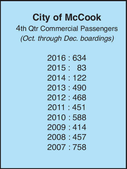 The McCook airport boarded 1627 commercial passengers for the year, up from 333 and 402 passengers in 2015 and 2014, respectively.