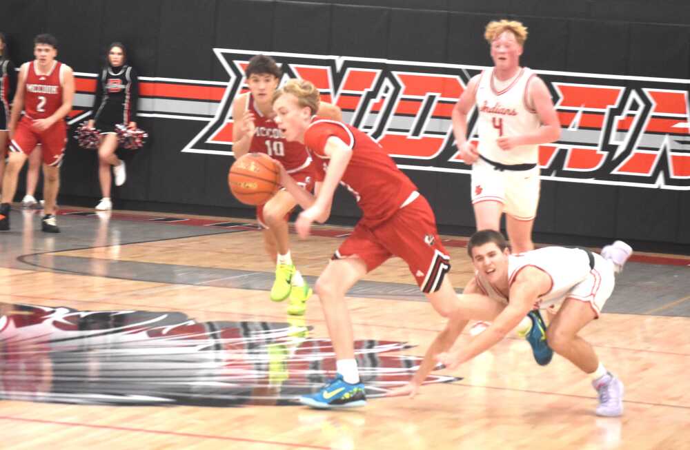 McCook sophomore Mason West gets both feet loose to start a fast break against the Broken Bow Indians in a 70-57 Bison victory Tuesday evening.