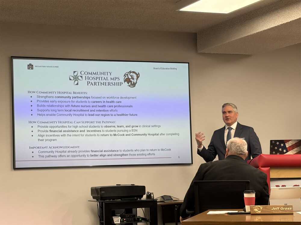 Norgaard offered a presentation highlighting the proposed UNMC–McCook Public Schools Nursing Pathway, outlining opportunities for students to pursue healthcare careers through a formalized partnership.