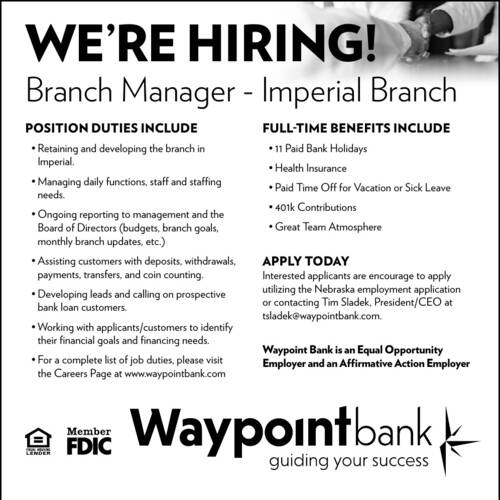 LABORER I - The City of McCook is accepting applications for a full-time Laborer I position at the Transfer Station - Collection Department. Job duties include hauling large refuse items from alleys to the Transfer Station, including brush; repair and replace collection containers; assists with recycling and compost operations; operation of dump and sanitation trucks; maintenance of buildings, equipment, and grounds; minor vehicle repair; and other duties as required. A high school diploma or...