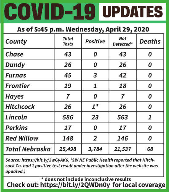 • One Hitchcock County resident – A male in his 60s who is self-isolating at home, and the investigation is still in process.